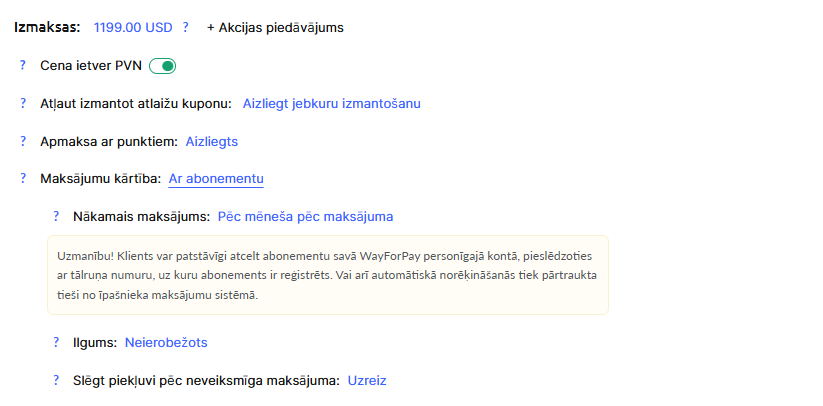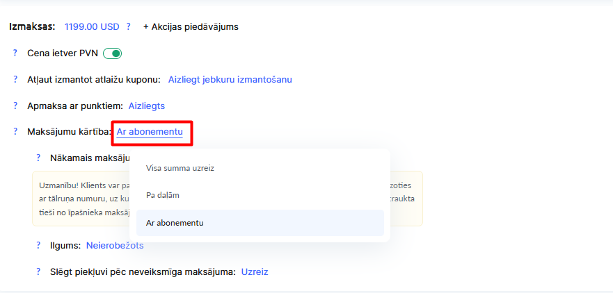 - Abonementu iestatīšana (atkārtoti maksājumi)