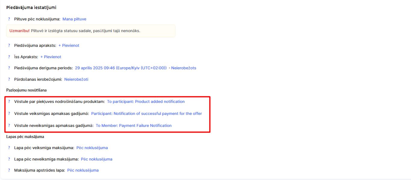 Mēs iesakām nemodificēt esošu piedāvājumu, bet gan izveidot jaunu piedāvājumu, lai varētu korekti reģistrēt un sekot maksājumiem atbilstoši atjauninātajiem iestatījumiem.