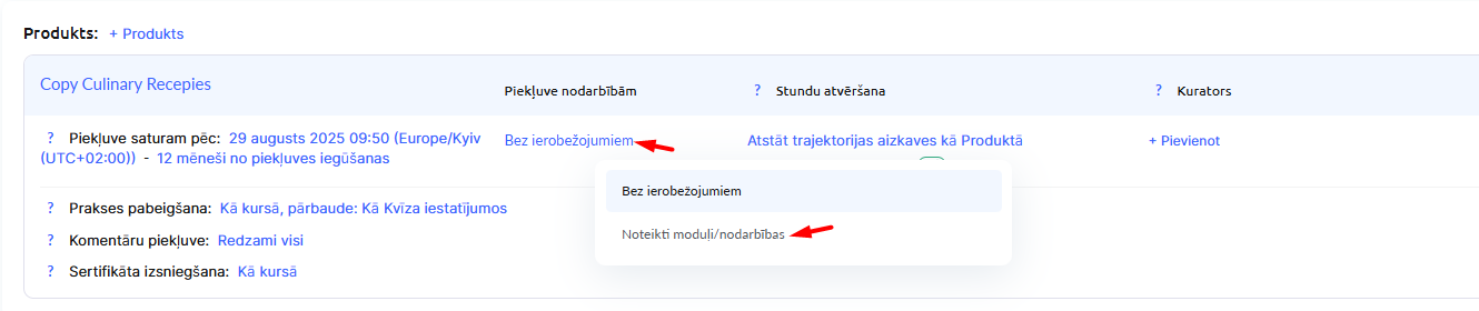 Ja vēlaties ierobežot piekļuvi nodarbībām šim konkrētajam tarifam (šim piedāvājumam), noklikšķiniet uz Neierobežots, pēc tam atvērtajā logā atlasiet vajadzīgās nodarbības.