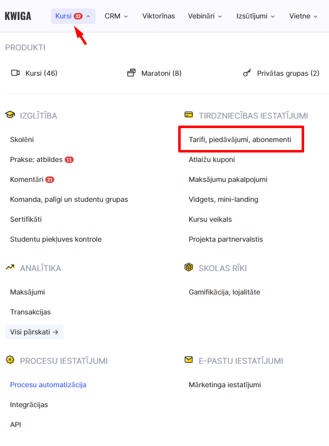 Lai izveidotu promocijas piedāvājumu, dodieties uz Kursi – Tarifi, piedāvājumi, abonementi.