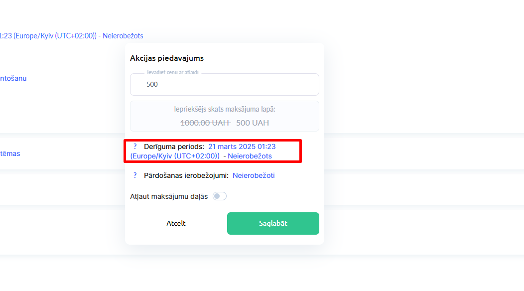 Piemēram, viena atlaide var būt aktīva līdz noteiktam datumam, un pēc tās beigām automātiski var sākties cita atlaide ar nedaudz augstāku cenu. Lai to izdarītu, vienas promocijas beigu datumam jāsakrīt ar nākamās promocijas sākuma datumu.