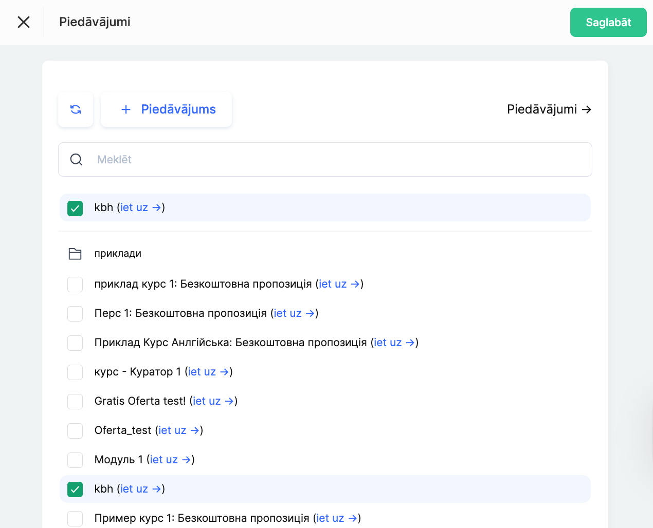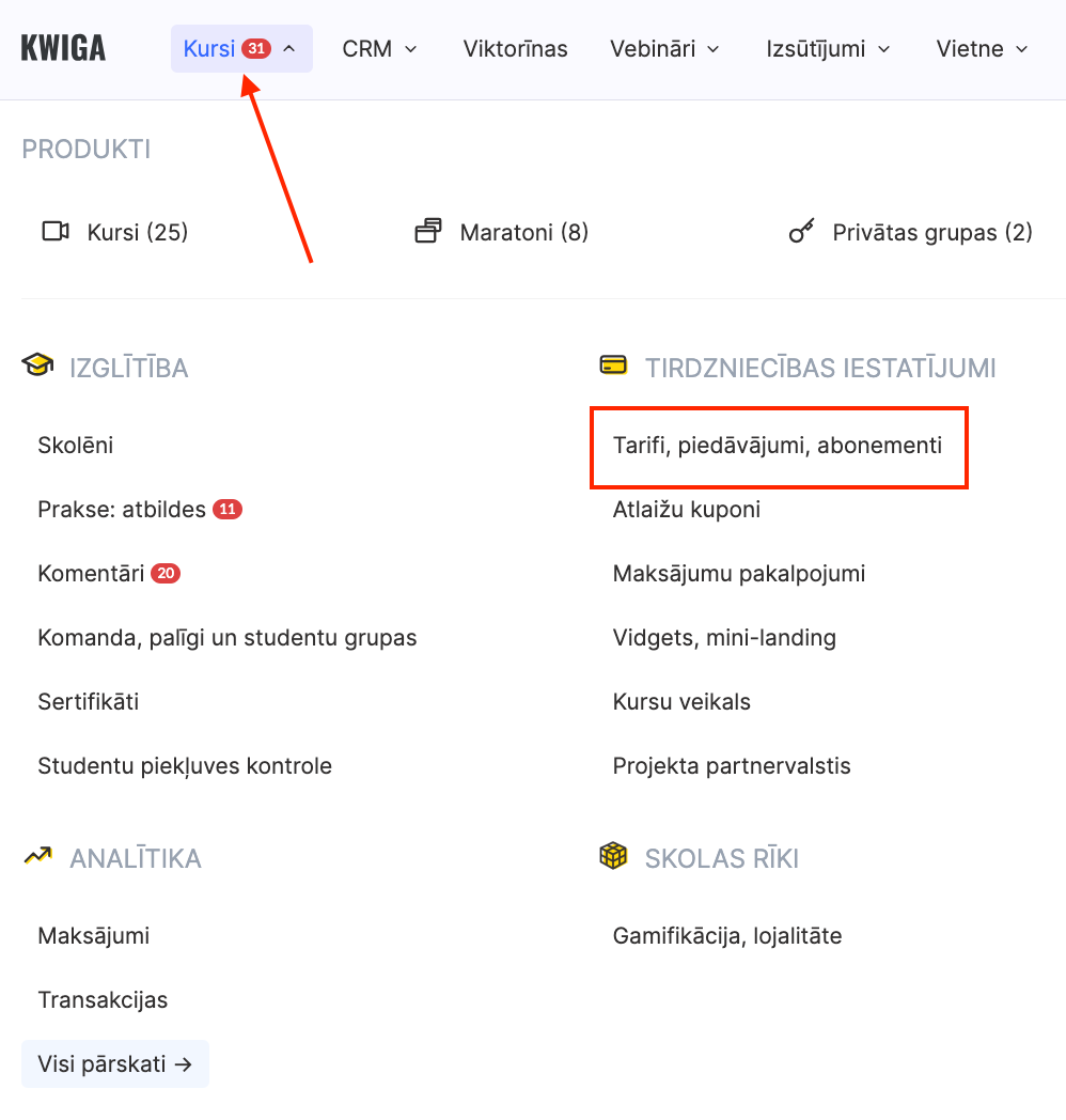 Dodieties uz izvēlni Kursi – Cenu plāni, Piedāvājumi un izveidojiet nepieciešamos piedāvājumus, ja tie vēl nav pievienoti. Sīkāka informācija par piedāvājumu izveidi ir atsevišķā rakstā.