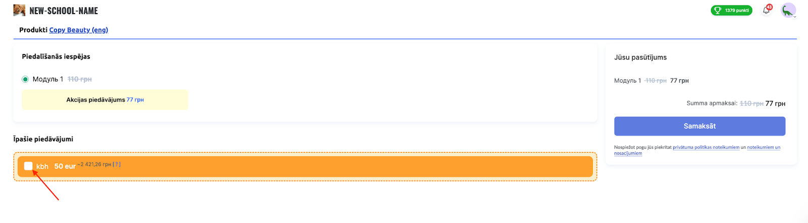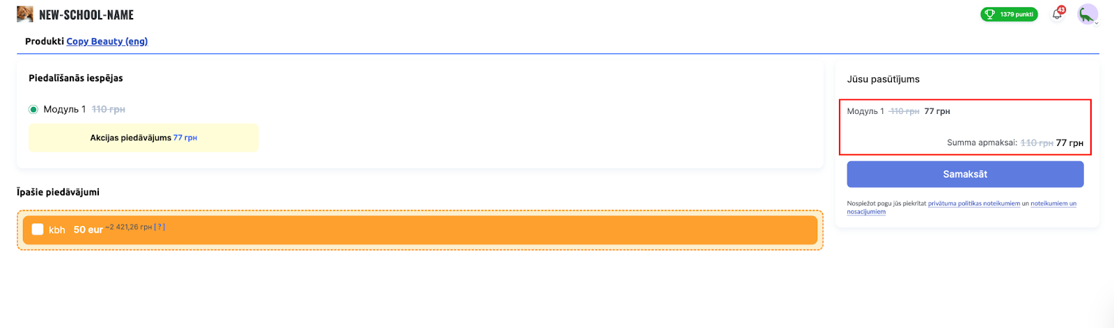 Ja students izvēlas papildu opcijas, kopējā summa automātiski tiek apvienota ar galveno produktu. Tas ļauj samaksāt par visiem izvēlētajiem pakalpojumiem vienā darījumā, ietaupot laiku, kas citādi būtu jāpavada veicot vairākus maksājumus.