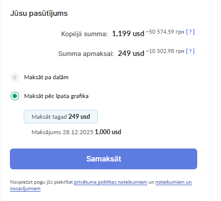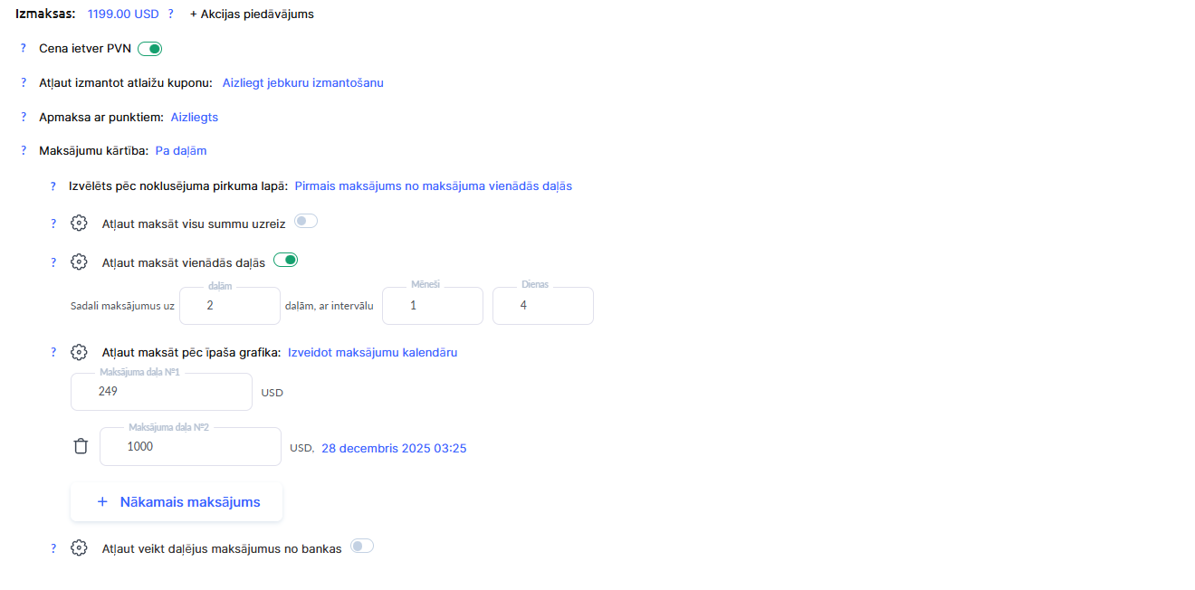 Papildus piemērā ir atļauta arī pilna apmaksa 1199 apmērā. Jūs varat atļaut pilnas summas tūlītēju apmaksu un norādīt lielāku kopējo summu, piemēram, 249 + 1000, lai motivētu tos, kuri dod priekšroku samaksāt visu uzreiz.