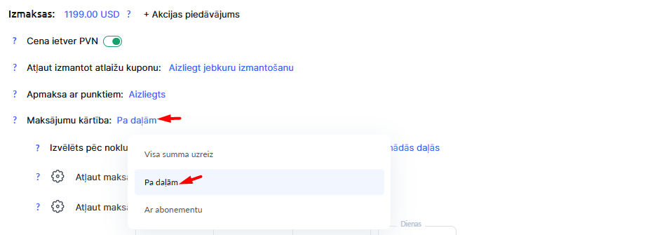 Izvēloties Pa daļām maksājuma kārtībā, tiks parādīti jauni iestatījumi: