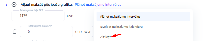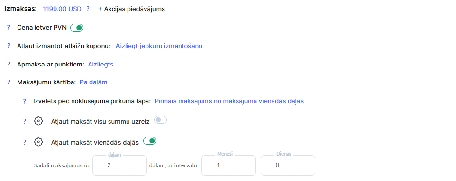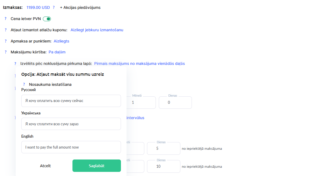 Atļaut pilnu apmaksu uzreiz — šis slēdzis ļauj klientiem samaksāt visu summu vienā maksājumā. Dažkārt pilnai apmaksai tiek izveidoti atsevišķi piedāvājumi; šādos gadījumos šo opciju var atspējot konkrētajā piedāvājumā.