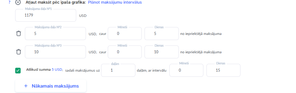 Plānot maksājumu intervālus — ļauj iestatīt dažādas summas un periodus katram maksājumam pa daļām. Tas nodrošina elastību personalizētu maksājumu plānu izveidē, kur katrai kopējās summas daļai var būt atšķirīga summa un atšķirīgi laika intervāli.