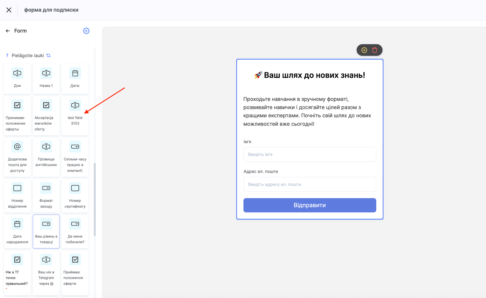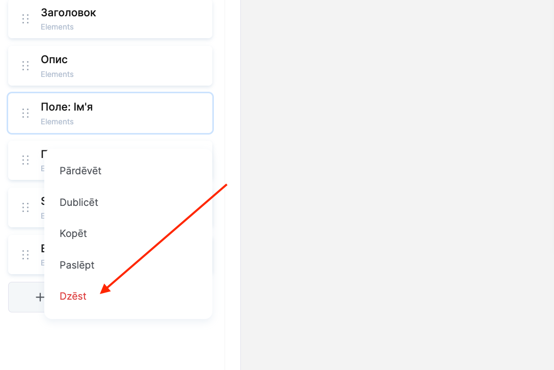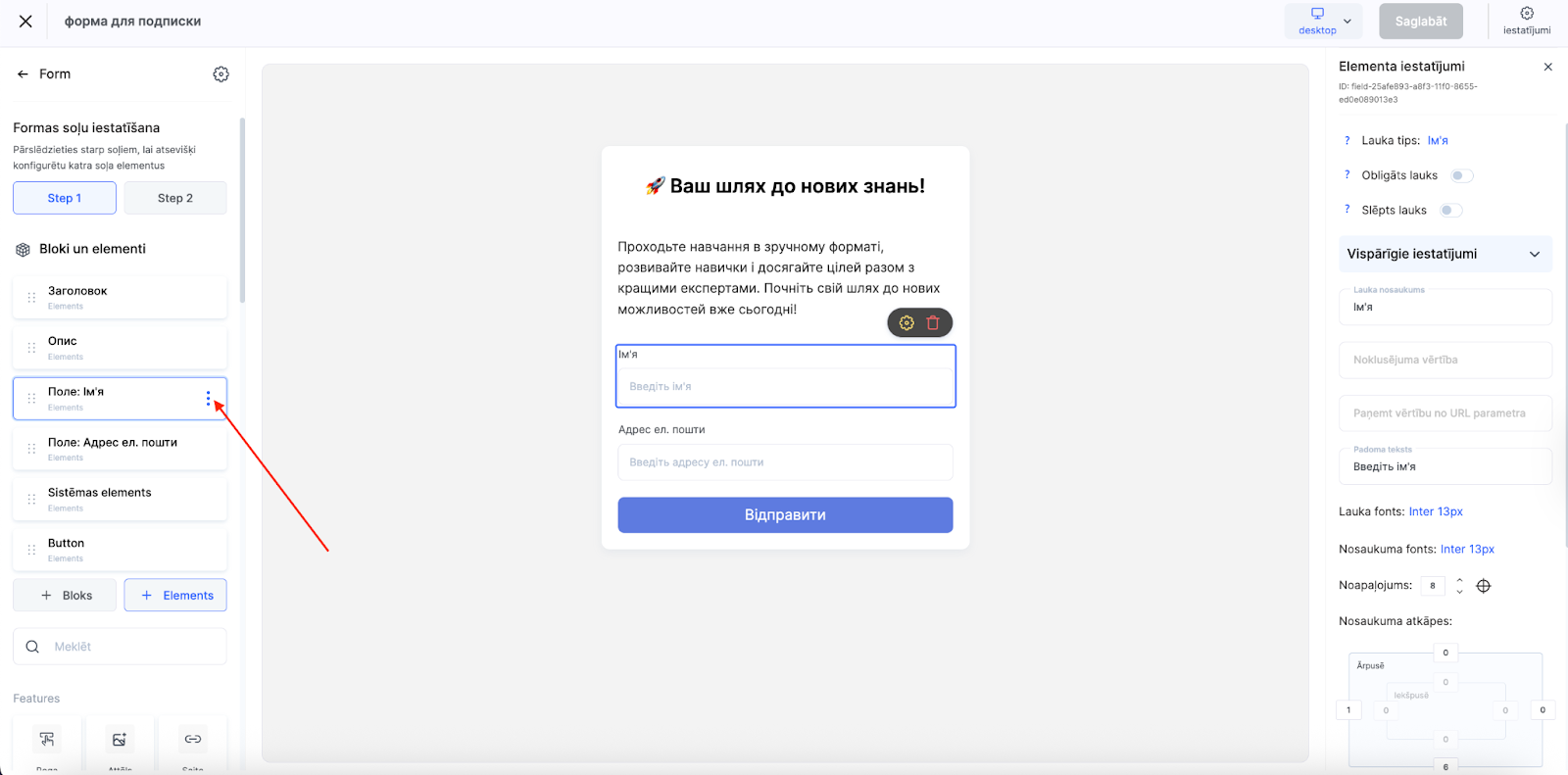 Similarly, you can add more elements (fields to the form) using the +Element button. To change the position of a field, for example, to place the phone input field under the name, drag the element higher in the block settings and place it in the desired position.