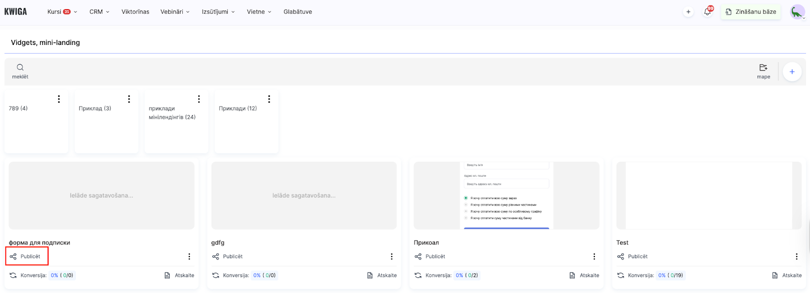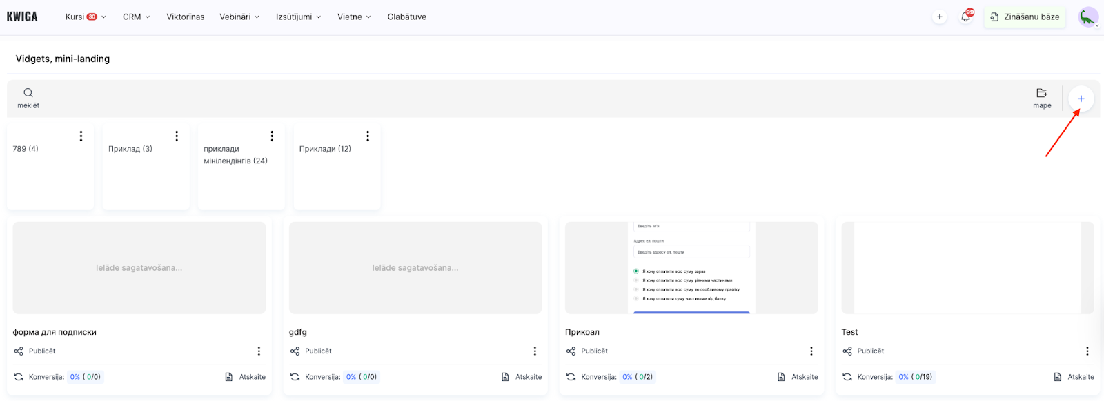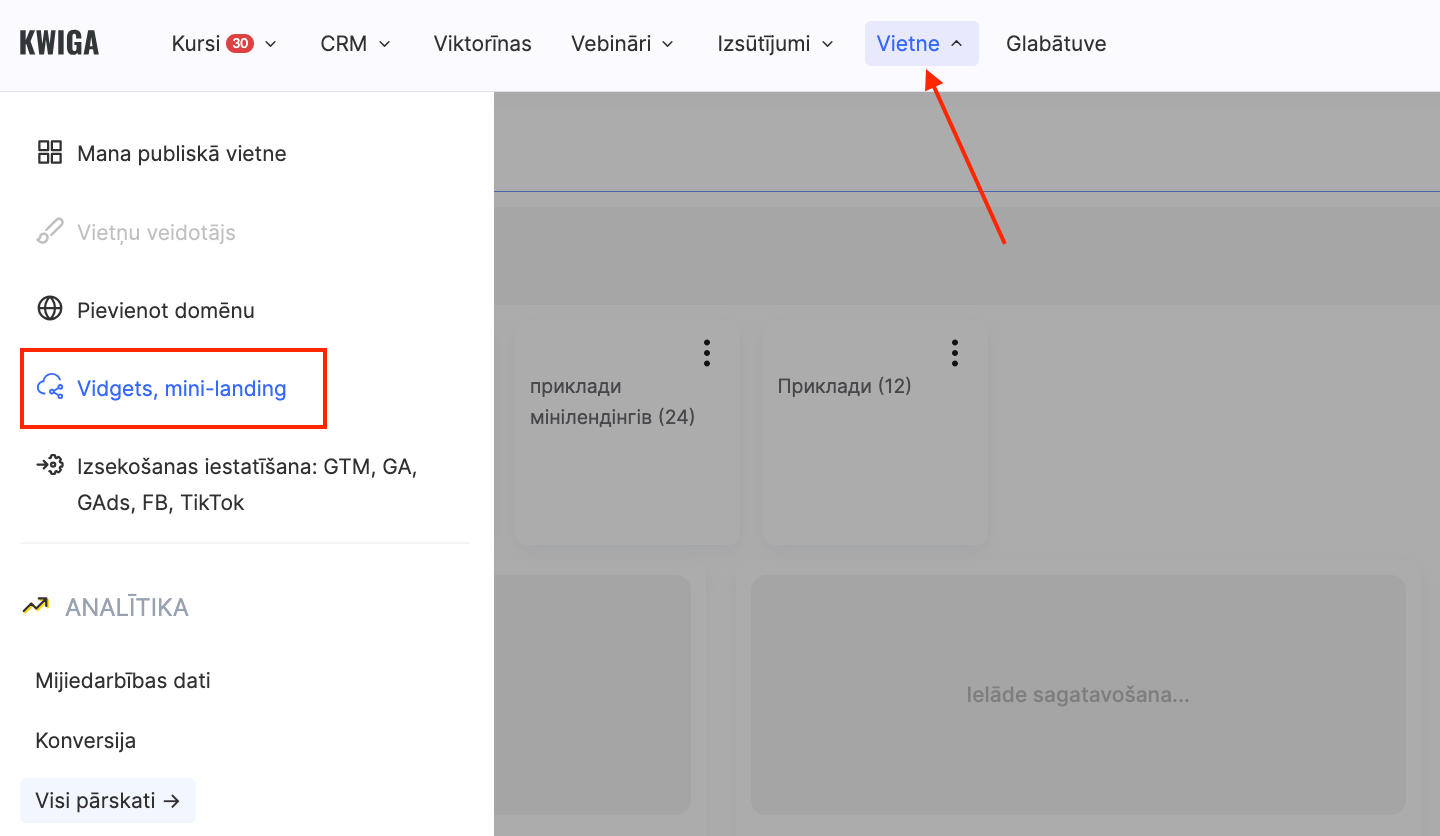 Lai izveidotu reģistrācijas logrīku, dodieties uz sadaļu Vietne – Logrīks, Mini-lapas savā Kwiga vadības panelī.
