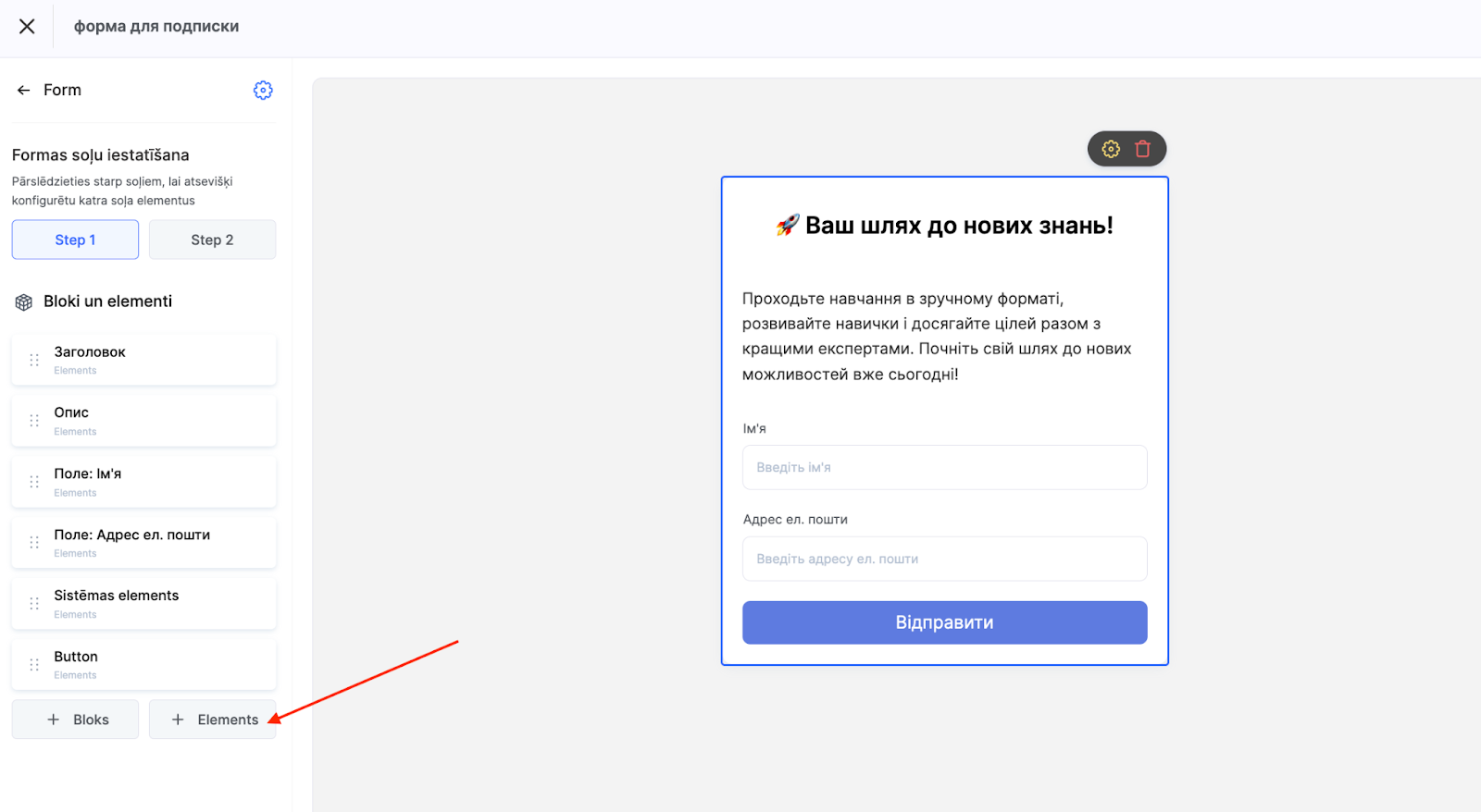 Pēc noklusējuma forma ietver laukus vārda un e-pasta ievadei, taču varat pievienot tik daudz papildu lauku, cik nepieciešams. Izmantojiet pogu +Elements, lai, piemēram, pievienotu tālruņa numura lauku.