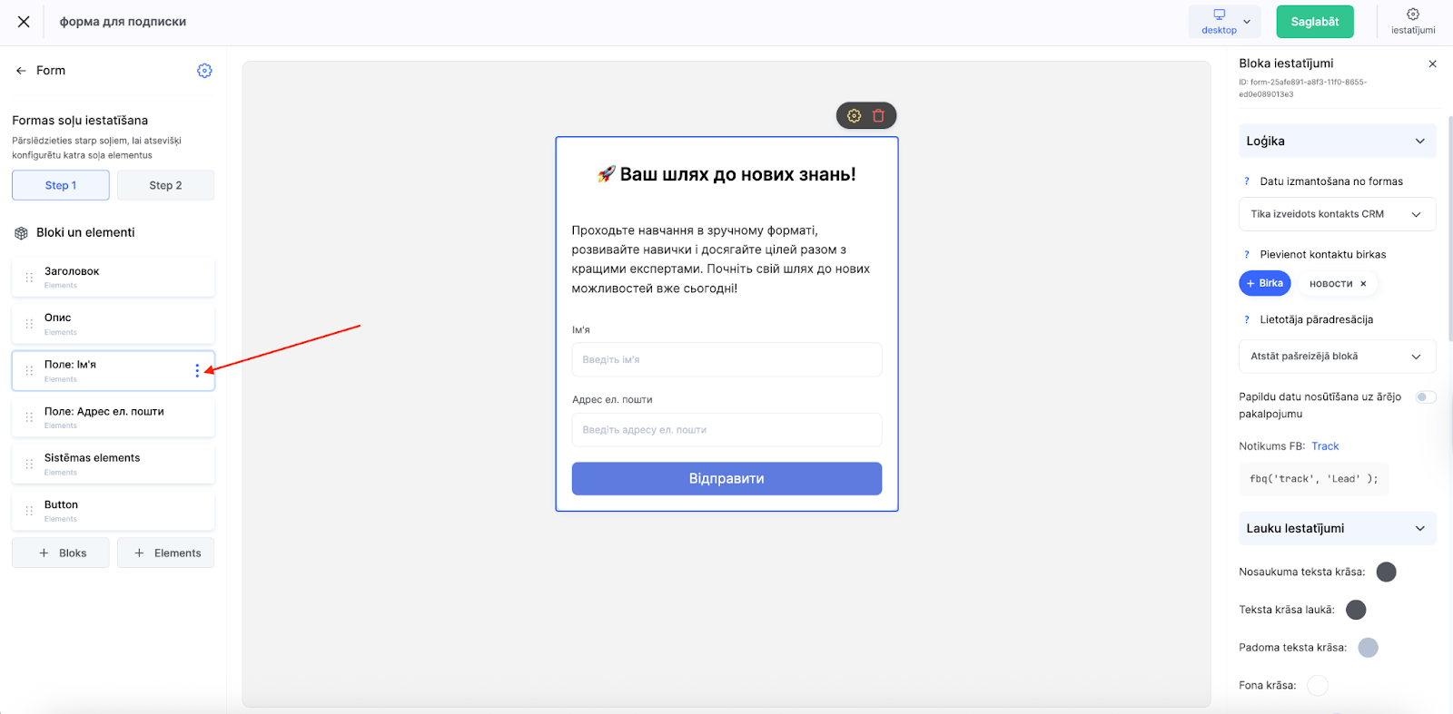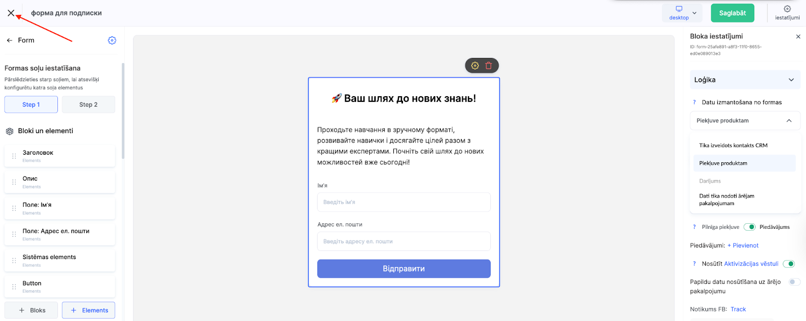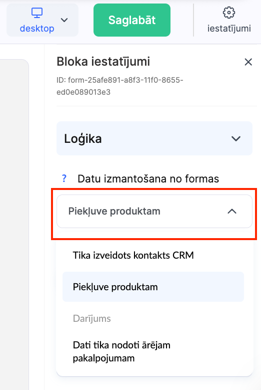 Piezīme: neievietojiet maksājumu sistēmas saiti logrīka iestatījumos manuāli. Forma automātiski izveido CRM kontaktu un novirza lietotāju uz maksājumu pēc pogas nospiešanas.
