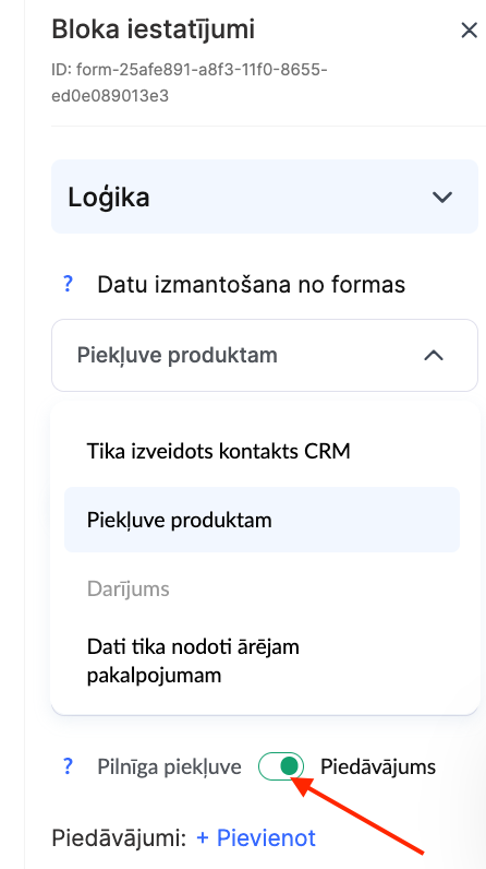 Mainiet piekļuves iestatījumu no Pilna piekļuve uz Piedāvājums. Noklikšķiniet uz +Pievienot un atlasiet atbilstošo cenu plānu (piedāvājumu). Pēc formas iesniegšanas sistēma automātiski novirzīs pircēju uz maksājuma lapu.