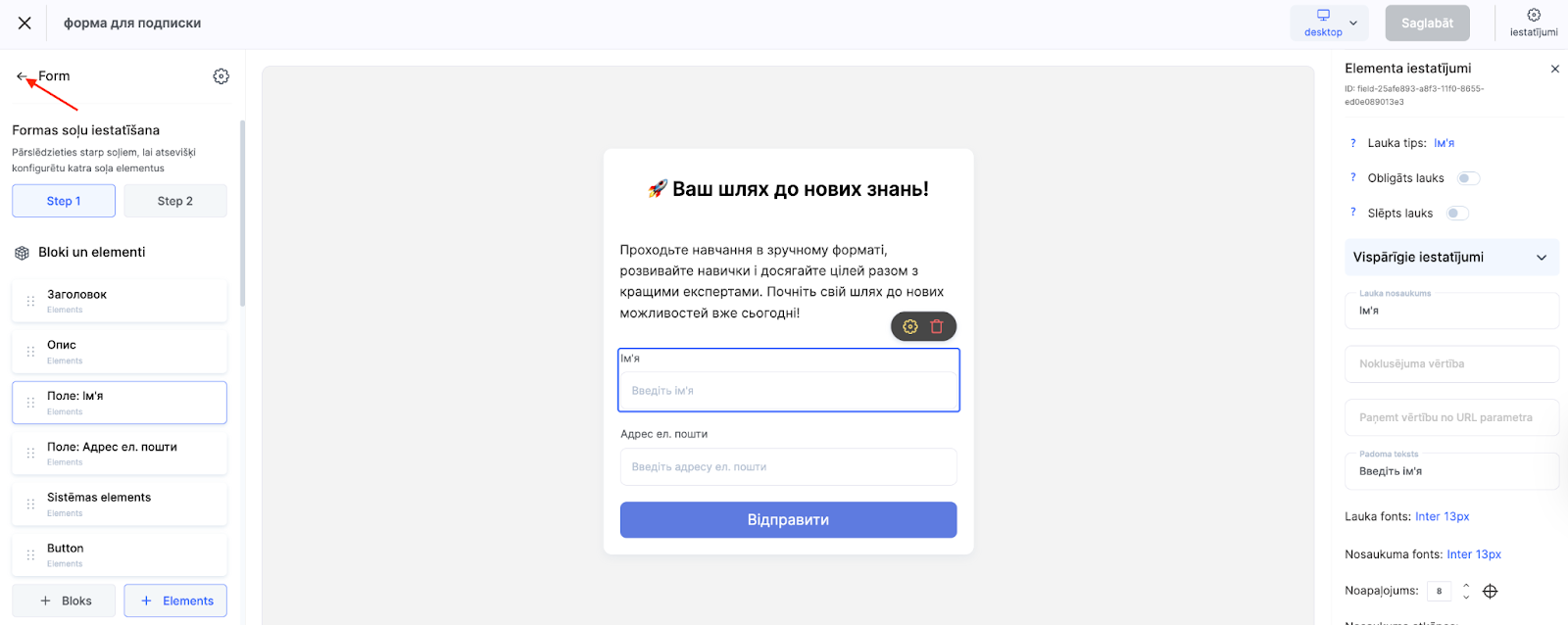 Pielāgojiet pogas tekstu, padomus, fontu, izmēru un krāsu. Lai atgrieztos no atsevišķa lauka iestatījumiem uz bloka iestatījumiem, izmantojiet atpakaļ bultiņu augšējā kreisajā stūrī sānu panelī. Velciet elementus, lai mainītu lauku secību, piemēram, pārvietojiet tālruņa numura lauku zem vārda lauka.