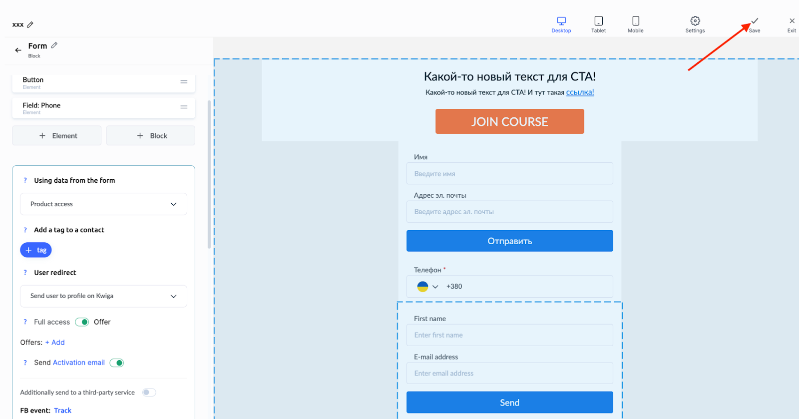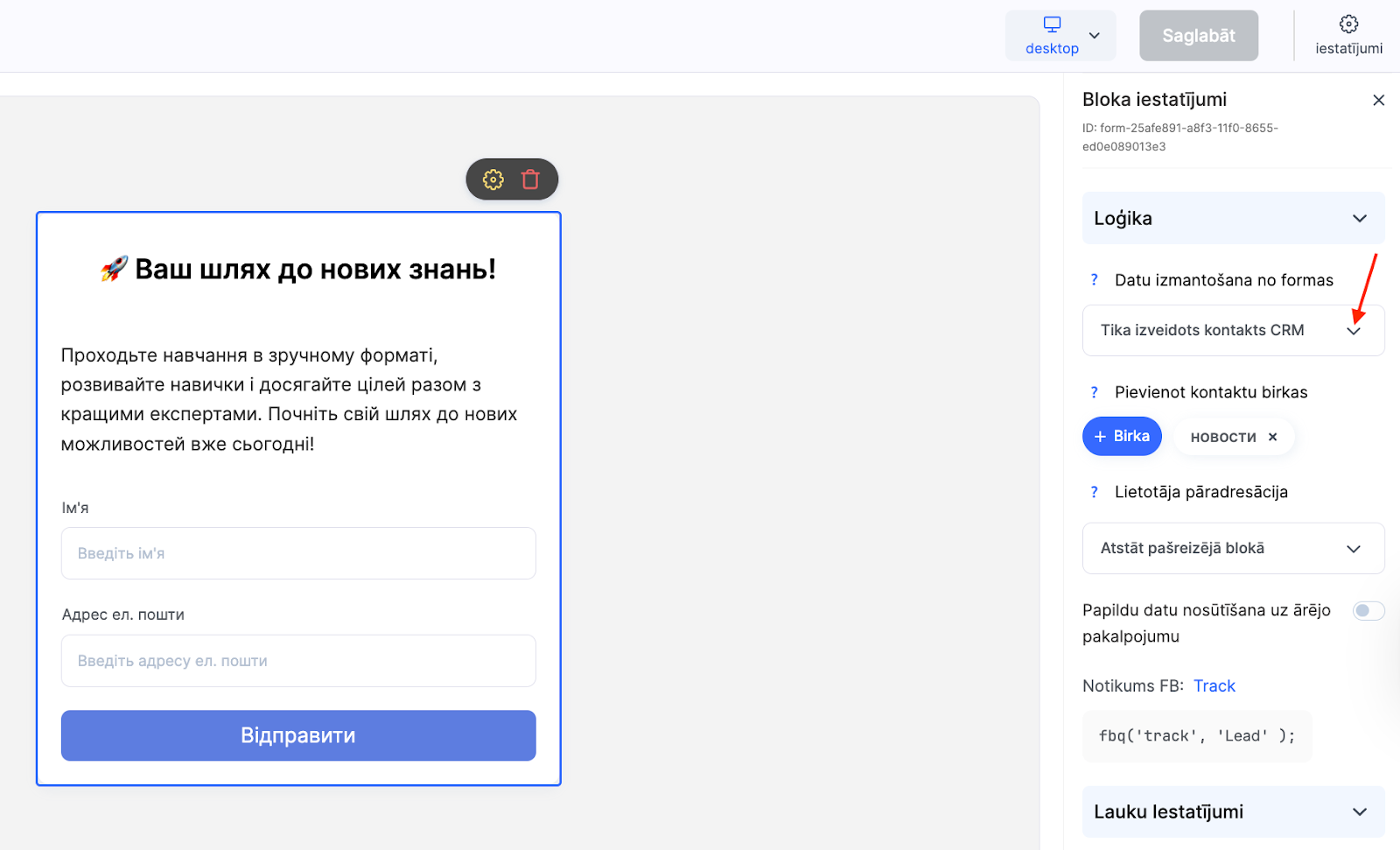 Pievienojiet nepieciešamos tagus, lai filtrētu kontaktus CRM sistēmā. Konfigurējiet lietotāja novirzīšanu – izvēlieties Nosūtīt lietotāju uz profilu Kwiga.
