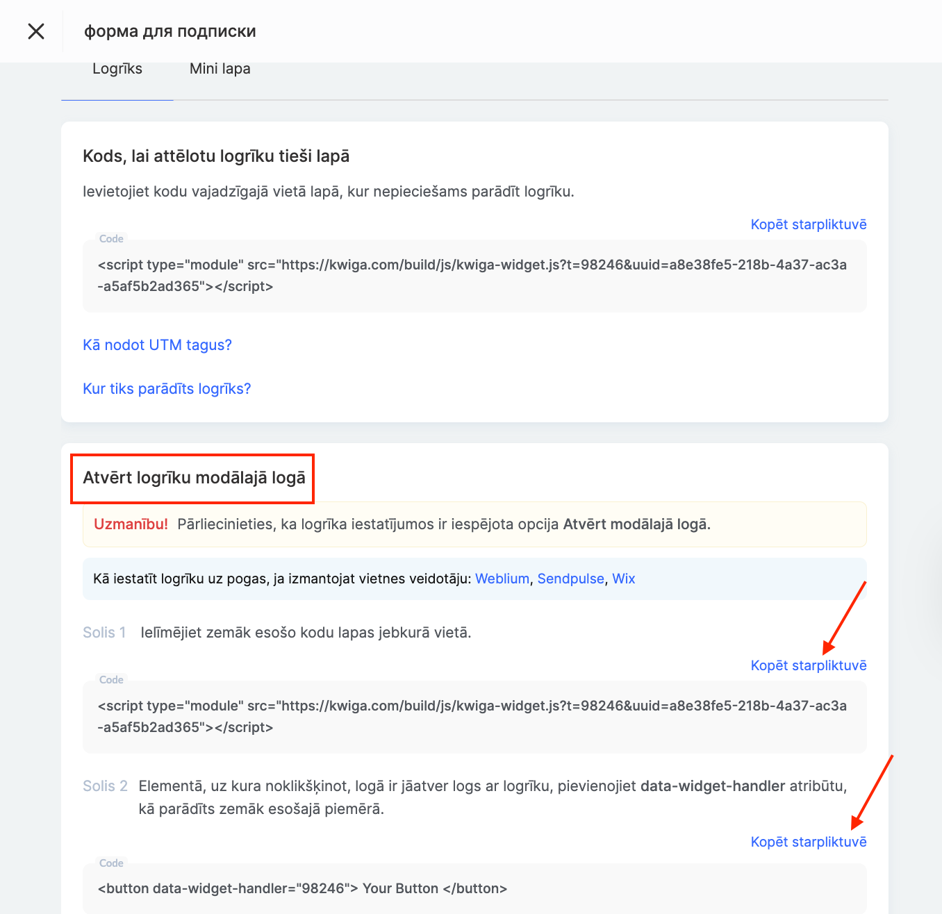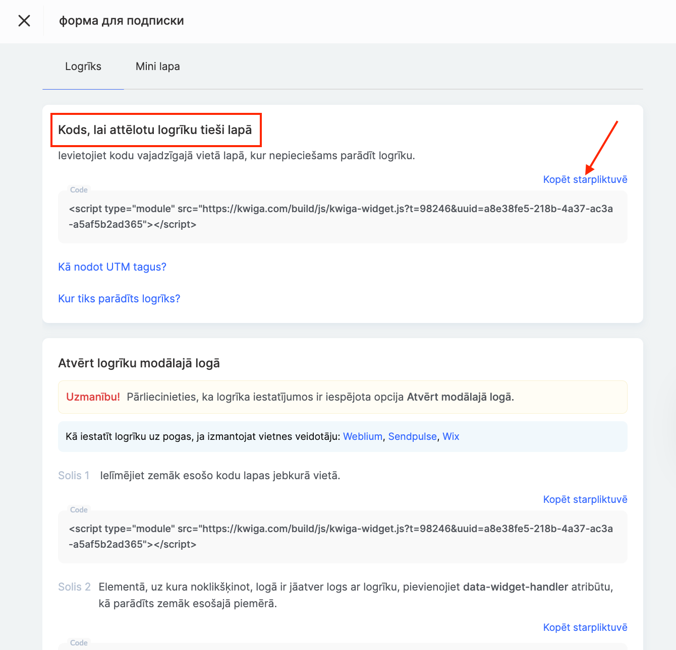 Ja izmantojat vietņu veidotājus, piemēram, Weblium, SendPulse vai Wix, skatiet viņu specifiskās instrukcijas par pareizu logrīka uzstādīšanu.