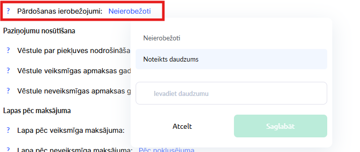 Atstājiet pārdošanas periodu nemainītu, taču varat dzēst vai pielāgot pārdošanas limitu.