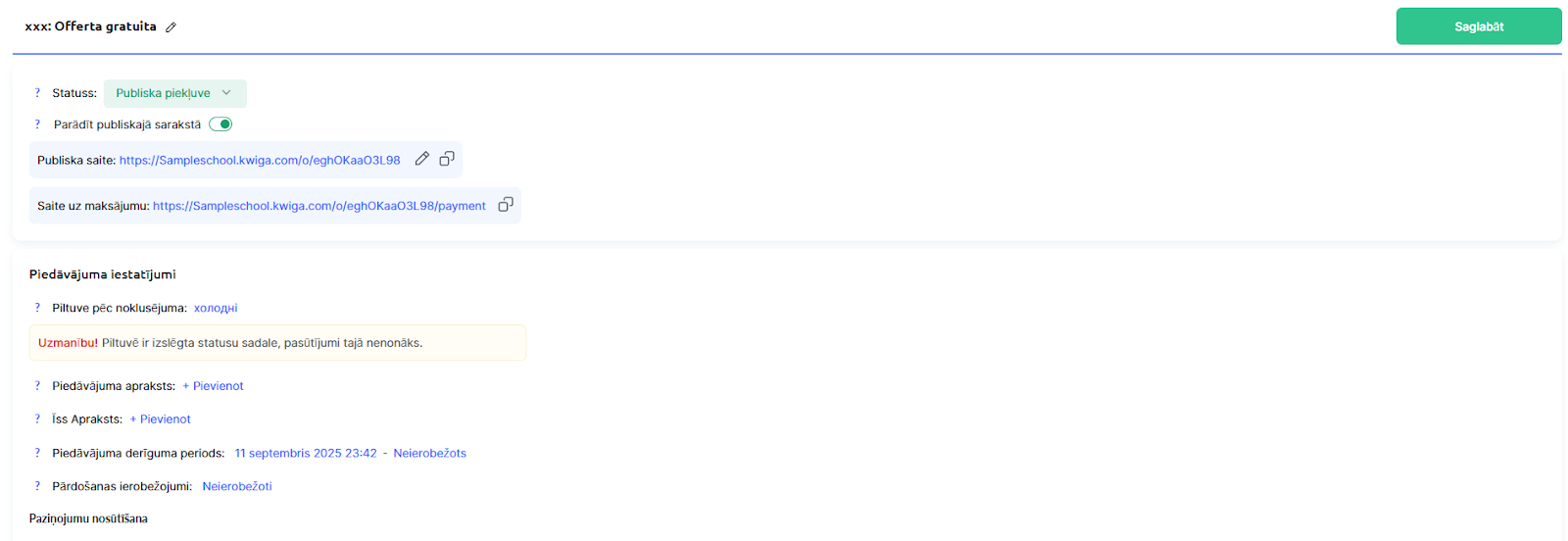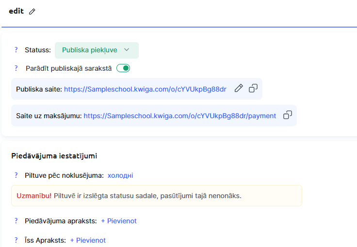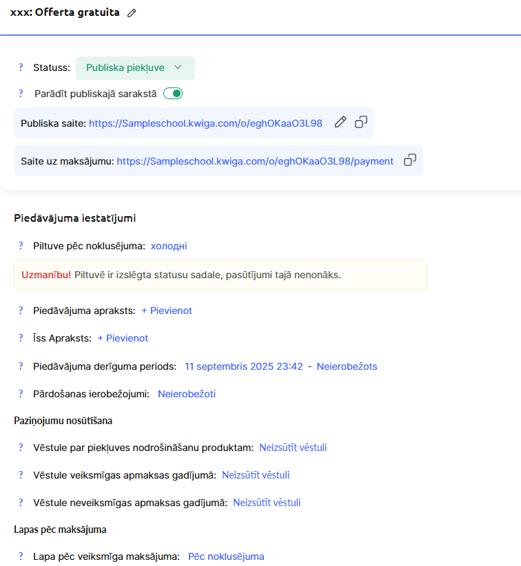 Pievienota maksājumu sistēma (ja plānojat pieņemt maksājumus caur Kwiga). Norādījumus par maksājumu sistēmas pievienošanu atradīsiet rakstā.