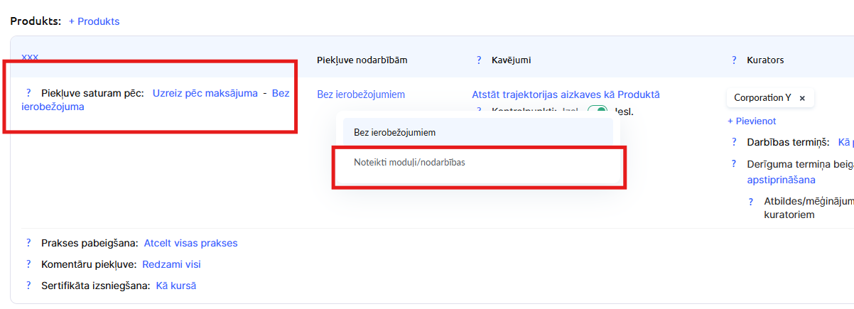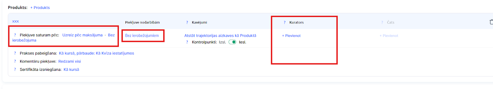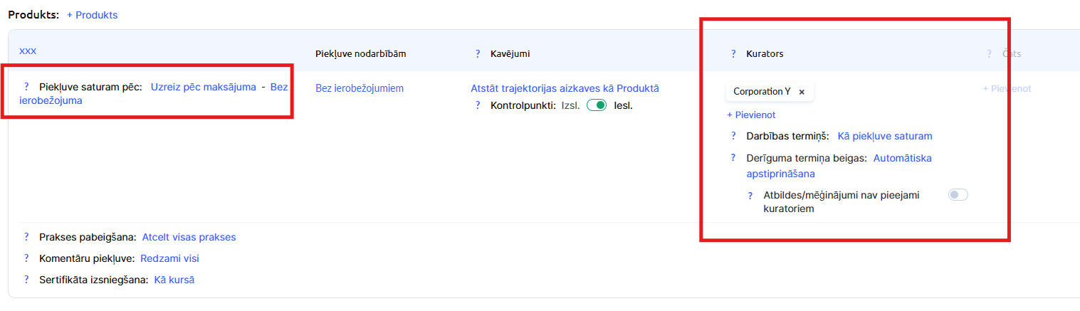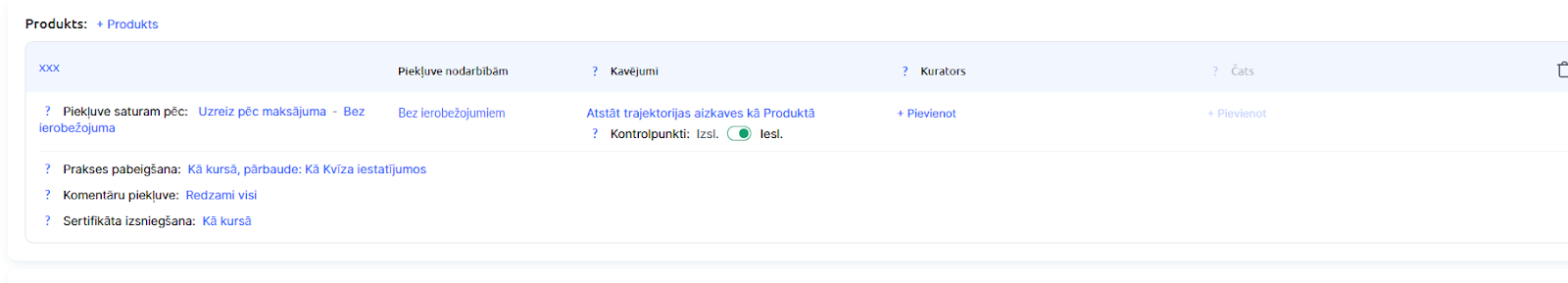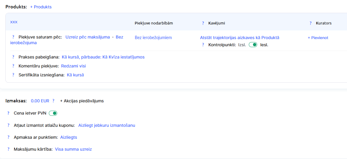 Galvenā sadaļa ir Produkts — tieši šeit jānorāda, kādu piekļuvi kursam studenti iegūs.
