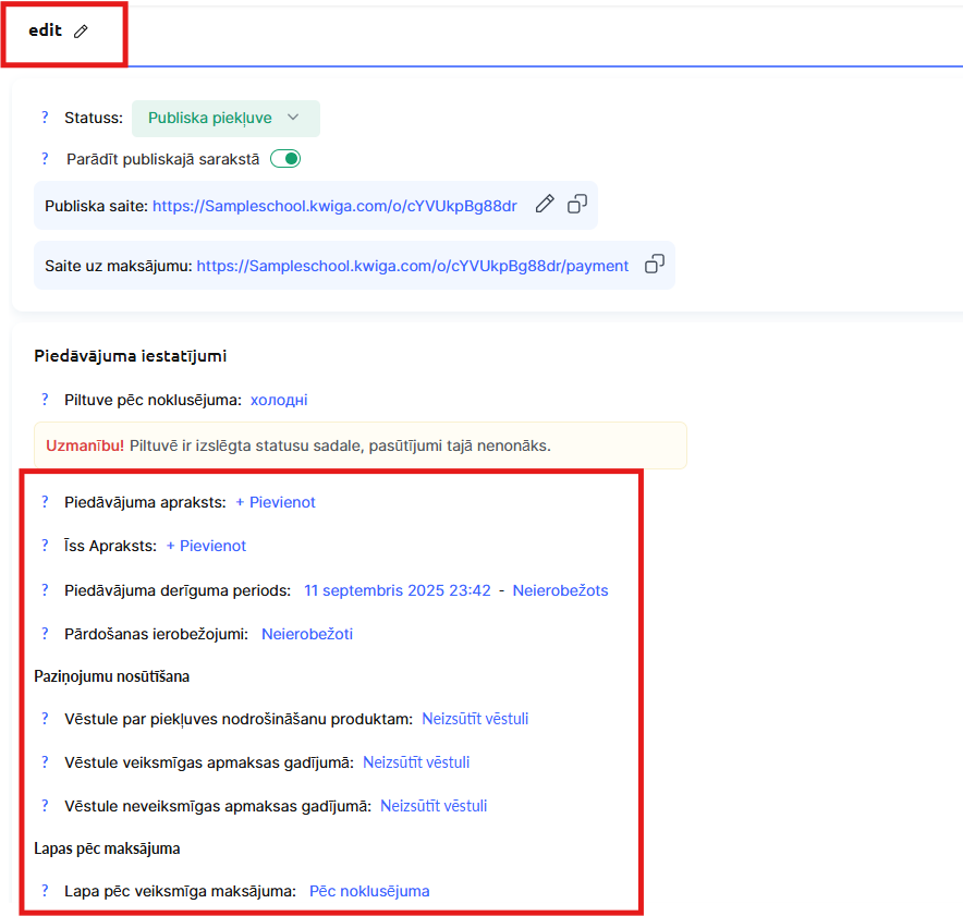 - Publiskā piedāvājuma lapas iestatīšana