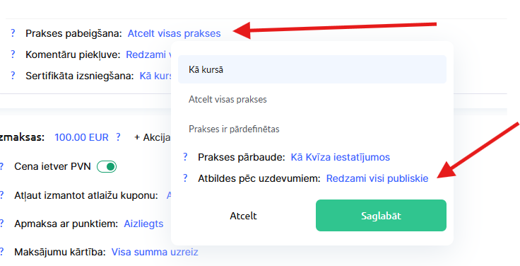 - Kursu veikals: iestatījumi un iespējas