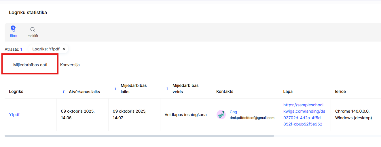 ● Kontakts – lietotāja kontaktinformācija ar saiti uz pilno ierakstu CRM sistēmā, lai veiktu turpmāku izsekošanu.