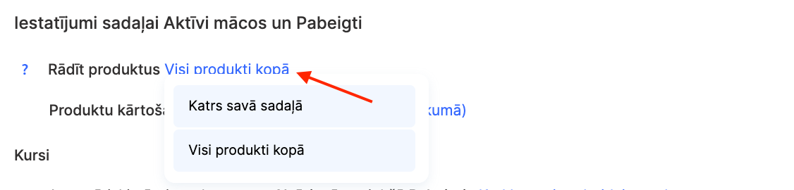 Lai to izdarītu, dodieties uz izvēlni Kursi un atveriet vienu no sadaļām blokā Produkti — piemēram, Kursi, un pēc tam atveriet Iestatījumi.