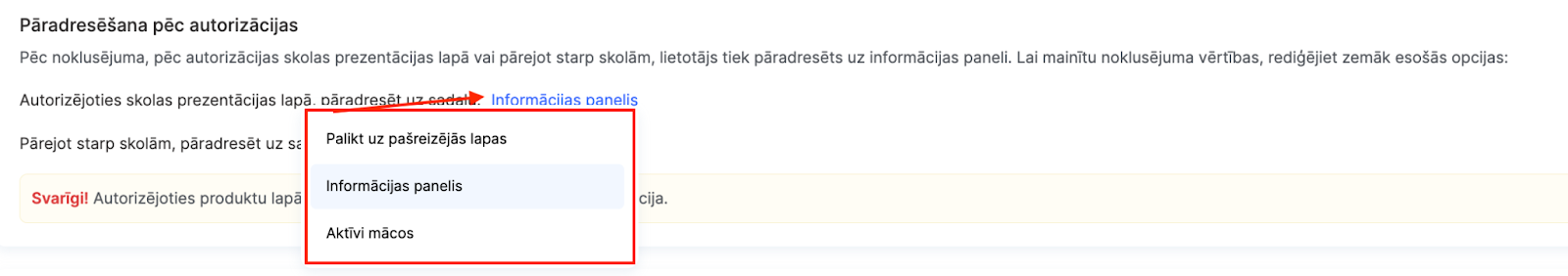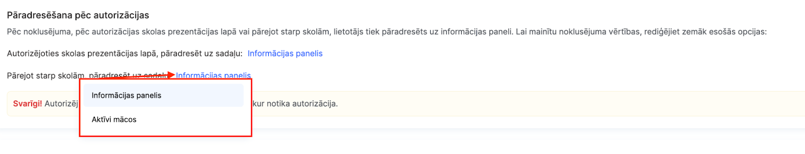 Pārejot starp dažādām skolām sistēmā, var iestatīt novirzīšanu uz Paneli vai uz Aktīvi mācās.