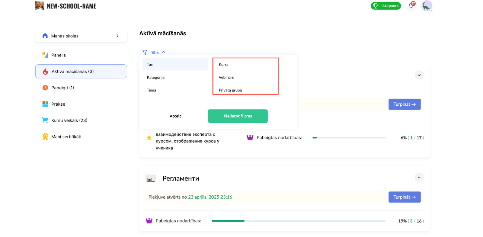 Aktīvi mācās bloks — nodrošina ātru piekļuvi visiem kursiem, vebināriem un grupām, kurus dalībnieks pašlaik apgūst. Ērts veids, kā turpināt mācības no vietas, kur tās tika pārtrauktas.