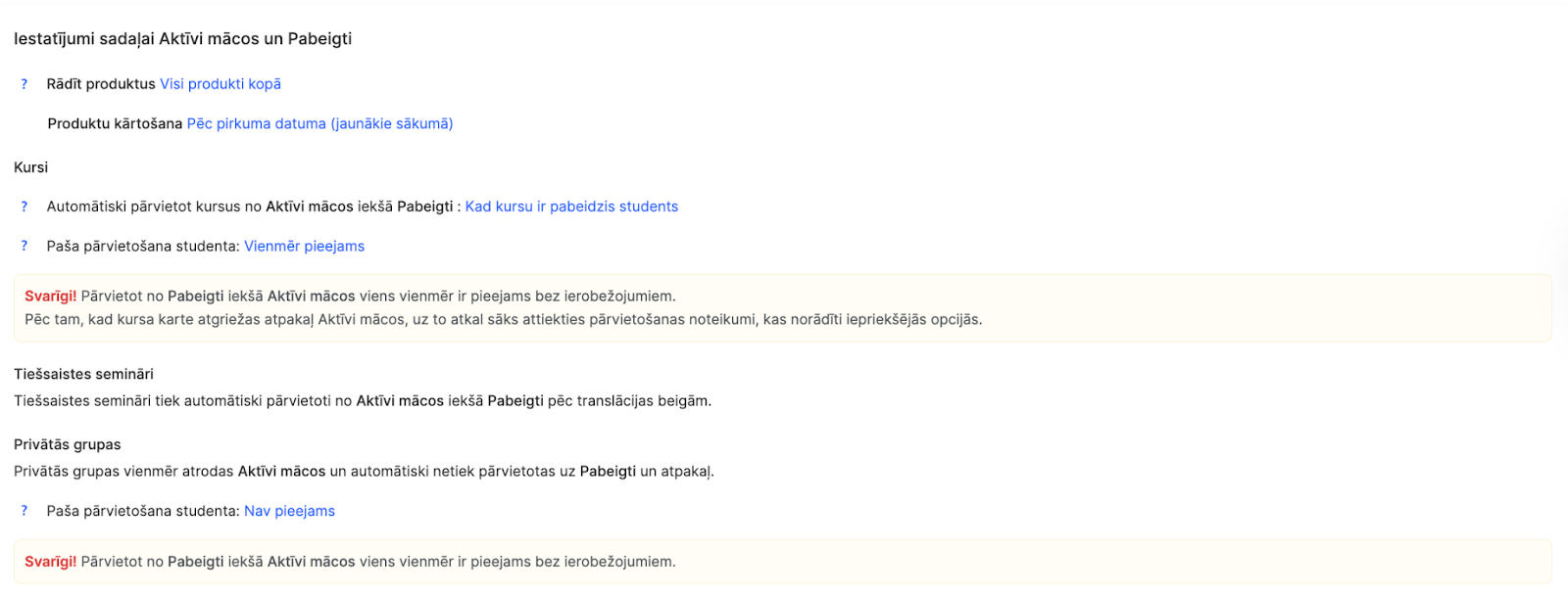 2. Iestatījumi sadaļām “Aktīvi mācās” un “Pabeigts”