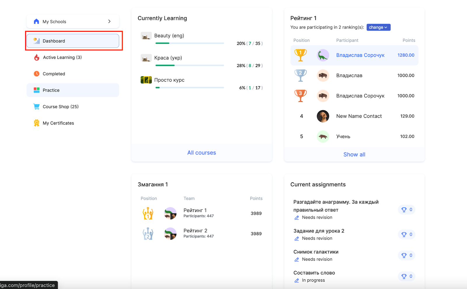 Sacensību bloks — attēlo aktīvās sacensības un turnīrus, kuros dalībnieks piedalās. Tas parādās automātiski, kad viņa reitings ir piesaistīts konkursiem.
