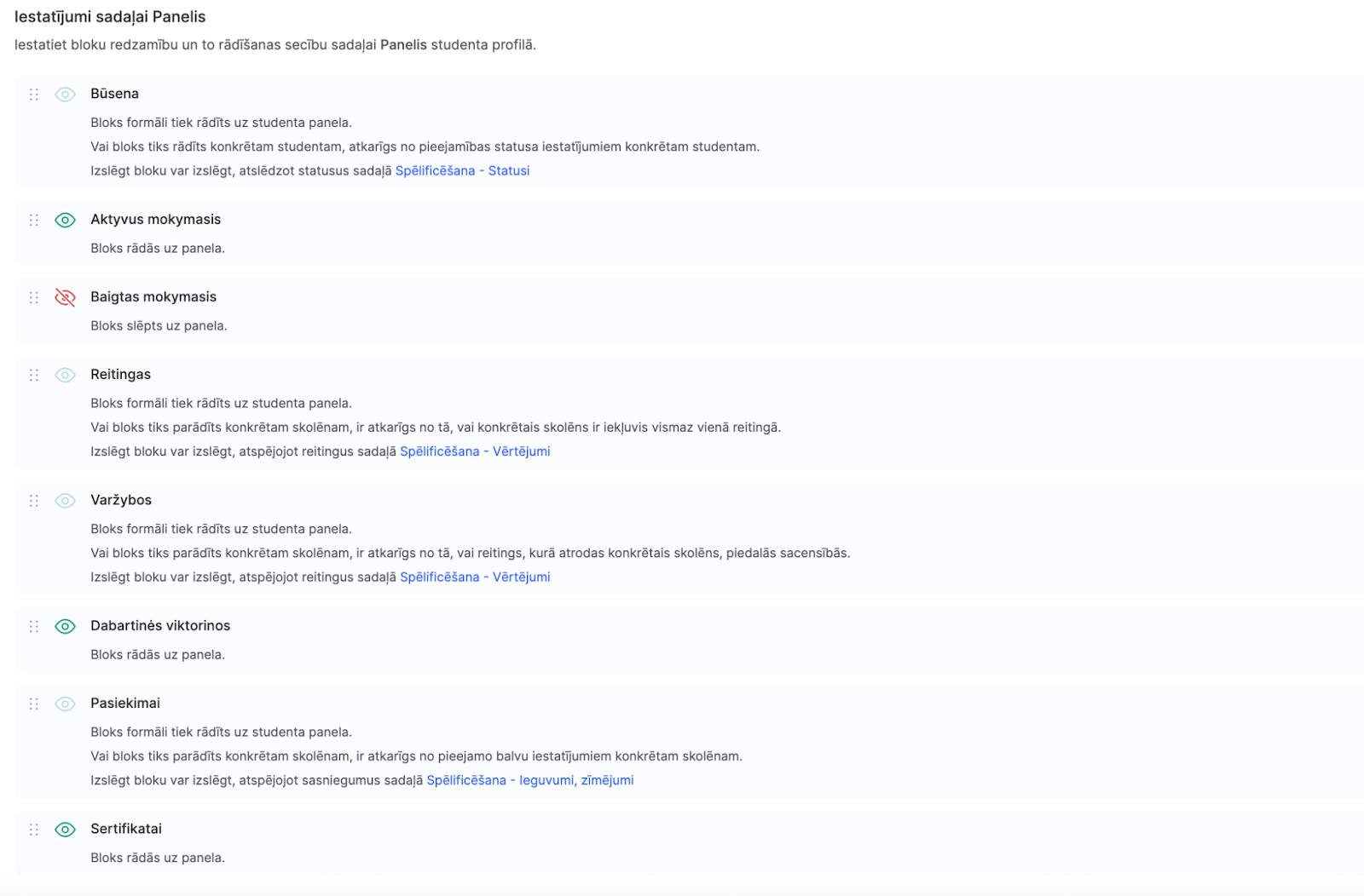 Administratori var pārvaldīt šo bloku redzamību sadaļā Profila iestatījumi → Paneļa sadaļas iestatījumi, izmantojot acu ikonu, un mainīt kārtību, tos velkot un pārvietojot.