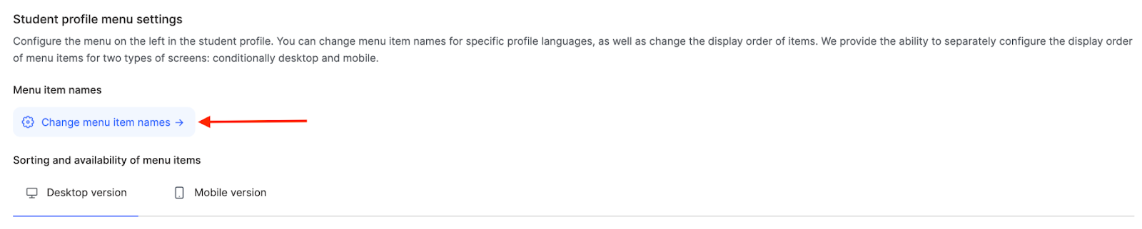 Lai mainītu izvēlnes vienumu nosaukumus, izmantojiet pogu Rediģēt izvēlnes nosaukumus. Šeit var pielāgot nosaukumus katrai vietnes valodas versijai atsevišķi. Piemēram, standarta Aktīvi mācās vietā var iestatīt Mani kursi vai Pašreizējās mācības, lai labāk atbilstu skolas komunikācijas stilam.