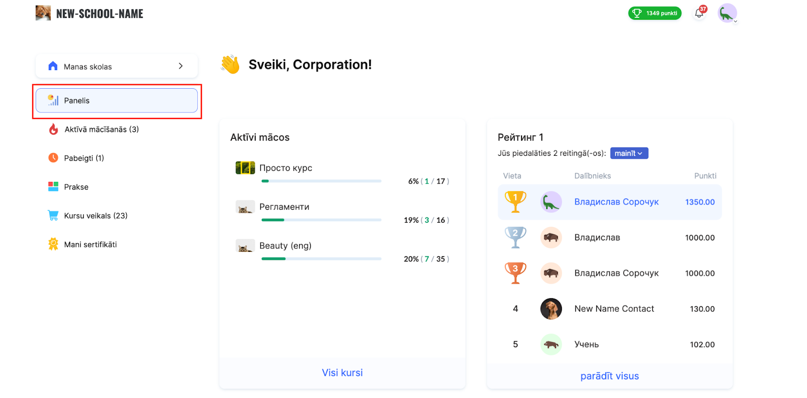 Sertifikāti — vienmēr ir pieejami panelī, nodrošinot pastāvīgu piekļuvi visiem dokumentiem, kas iegūti par pabeigtiem kursiem un izglītības programmām.