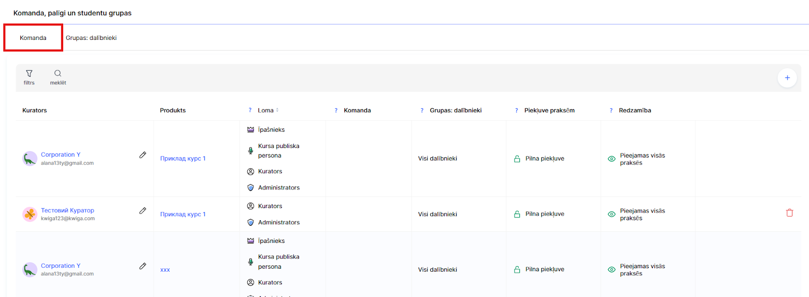 Izvēlieties Komanda, Asistenti un Studentu grupas → cilne Komanda.