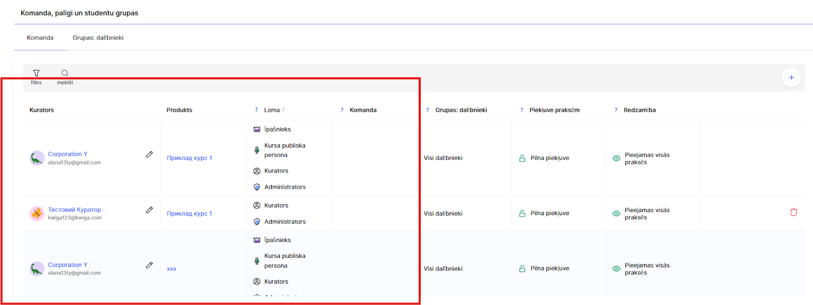 Kwiga ir īpaša sadaļa, kur var pārvaldīt asistentus, viņu lomas, komandas un studentu piekļuvi.