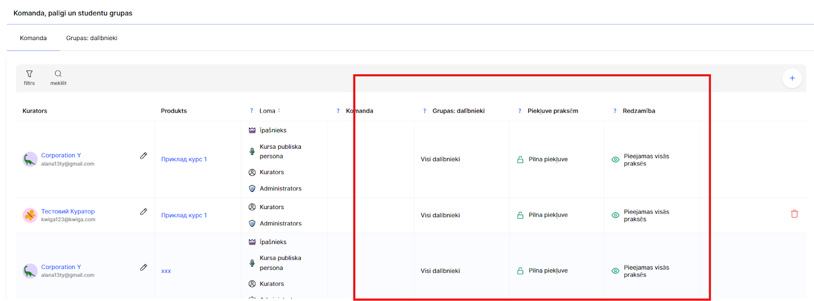 Platformā Kwiga ir iespējams noteikt, ar kuriem studentiem katrs asistents strādās. Pieejamas dažādas piekļuves iespējas: