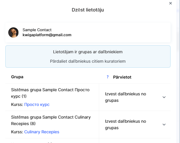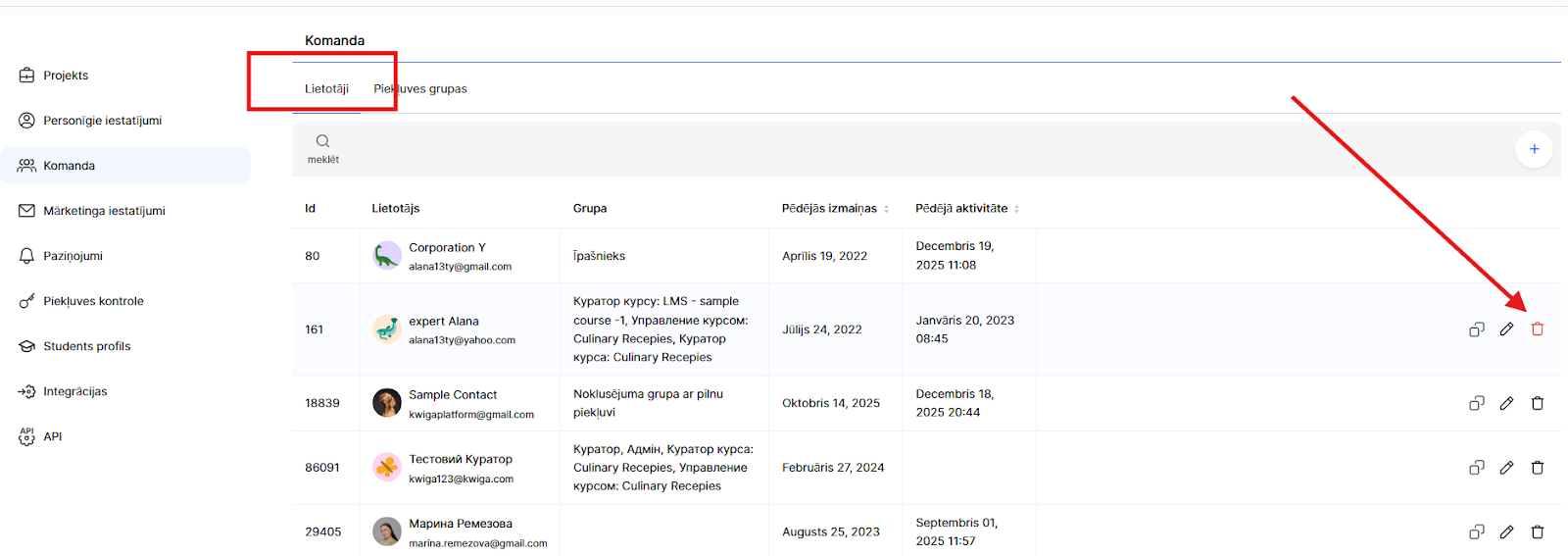 Svarīgi: ja jums nepieciešams noņemt lietotāju tikai no konkrēta kursa, nevis no visa projekta, lūdzu, sekojiet attiecīgajām instrukcijām šim gadījumam.