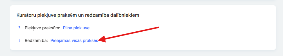 Šī funkcionalitāte ir noderīga, ja kurss ietver noteiktus praktiskos uzdevumus, kas paredzēti tikai atlasītiem asistentiem. Piemēram, ja viens asistents ir atbildīgs tikai par kursa teorētisko daļu, bet cits — par praktiskajiem uzdevumiem, jūs varat katram noteikt atbilstošu piekļuves līmeni. Ja jums nepieciešama elastīga piekļuves pārvaldība praktiskajiem uzdevumiem, plašāku informāciju atradīsiet atsevišķā rakstā.
