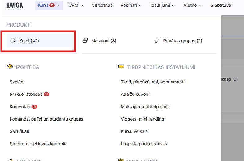 Doties uz izvēlni Kursi