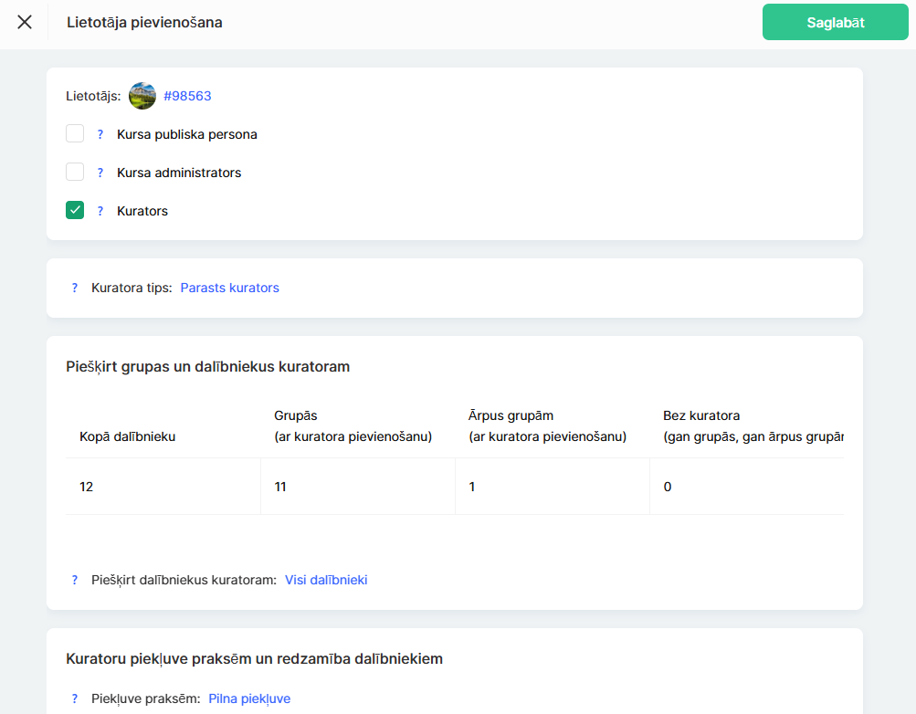 ● Konkrētas grupas: asistents redz tikai tos dalībniekus, kas viņam ir piešķirti. Tā ir labākā izvēle, ja kursā ir vairākas grupas vai paralēli mācību ceļi un katrs asistents ir atbildīgs tikai par savu dalībnieku daļu. Piemēram, ja kursā ir grupas iesācējiem un pieredzējušajiem, asistents strādā tikai ar viņam piešķirto kategoriju.