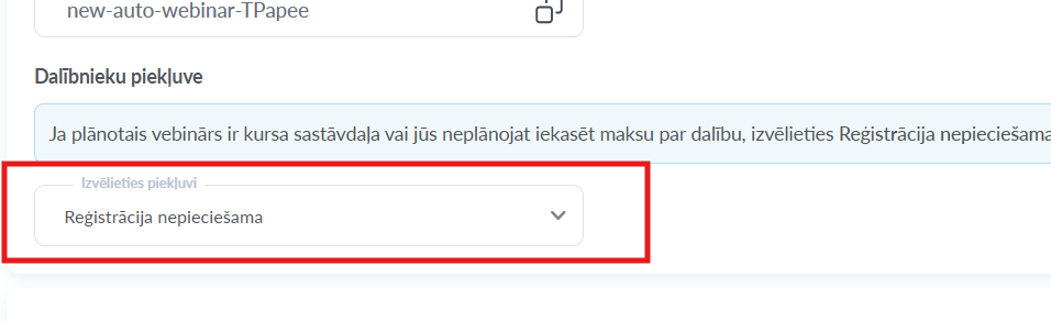 Lai organizētu bezmaksas automatizētu vebināru, dodies uz sadaļu Piekļuve un reģistrācija un izvēlies opciju Tikai reģistrācija nepieciešama.