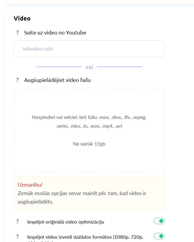 Tu vari augšupielādēt failus līdz 1 GB šādos formātos: .mov, .mp4, .3gp, .divx, .flv, .mpeg, .mpg, .wmv, .mkv.