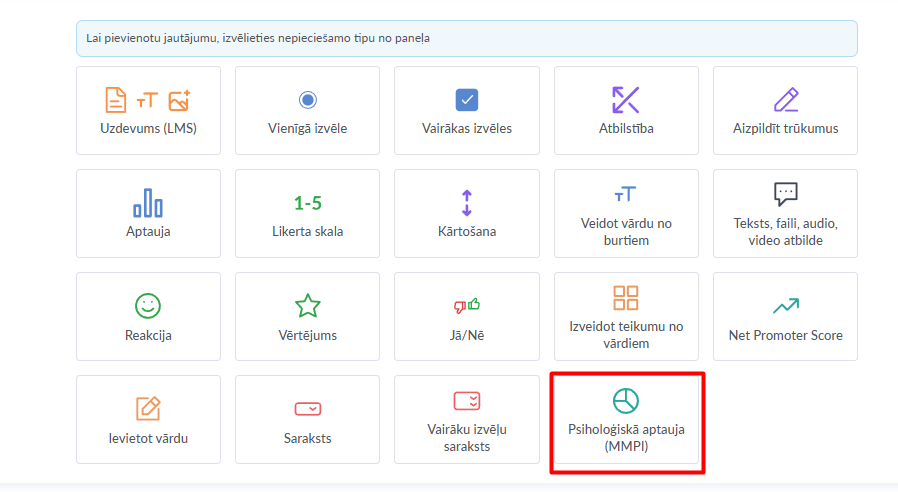 Noklikšķiniet uz Izveidot viktorīnu un izvēlieties jautājuma tipu MMPI.