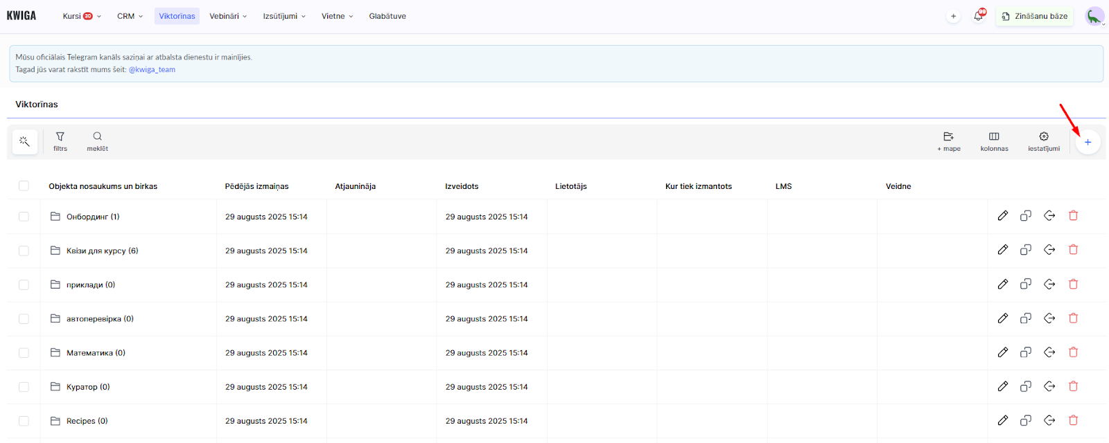 Dodieties uz izvēlni Viktorīnas savā Kwiga kontā. Noklikšķiniet uz pogas +, lai izveidotu jaunu viktorīnu.