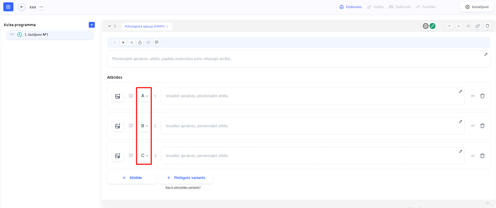Pievienojiet atbilžu variantus un piešķiriet tiem burtus no nolaižamās izvēlnes. Platforma pēc noklusējuma piedāvā A, B un C, taču jūs varat to mainīt atbilstoši sava testa loģikai.