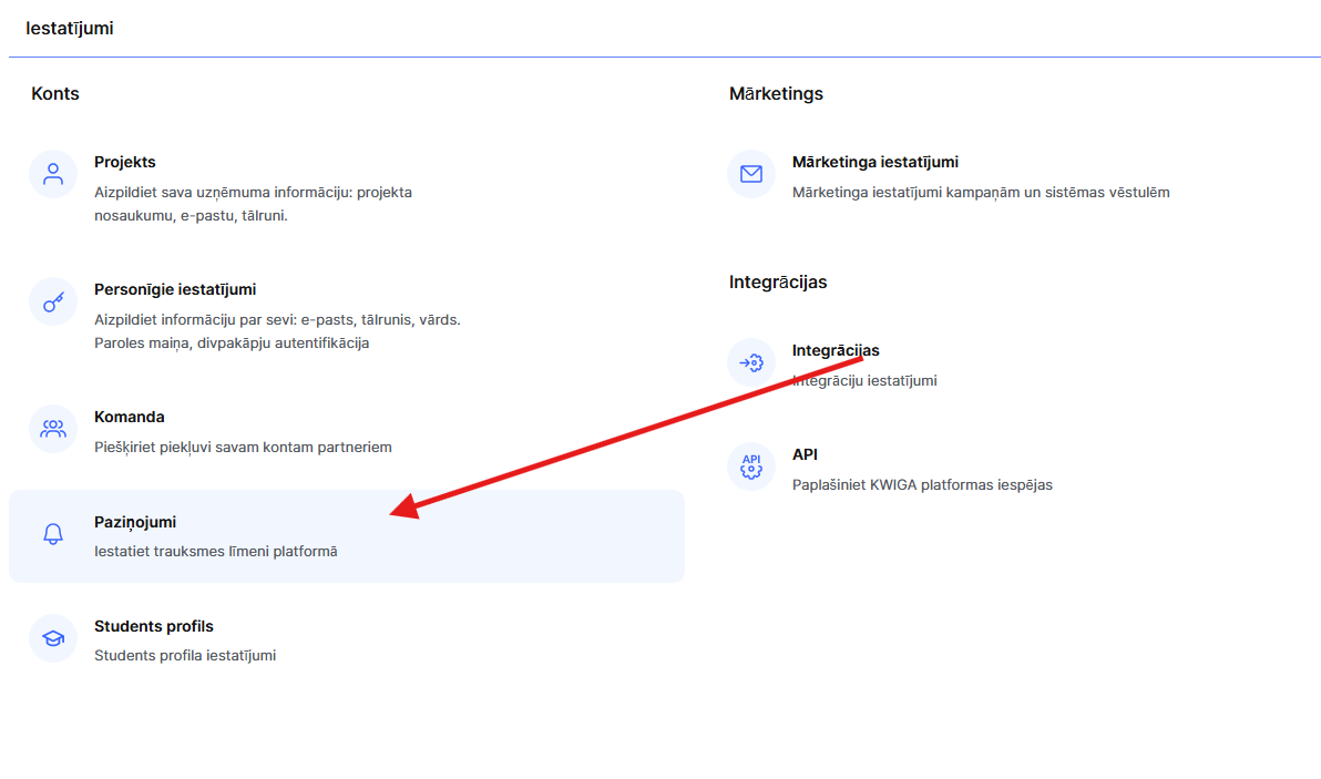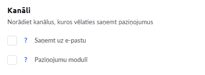 Šeit varat aktivizēt paziņojumu saņemšanu platformā, izmantojot zvaniņa ikonu, vai pa e-pastu, kā arī zemāk atlasīt konkrētos paziņojumus, kurus vēlaties saņemt.