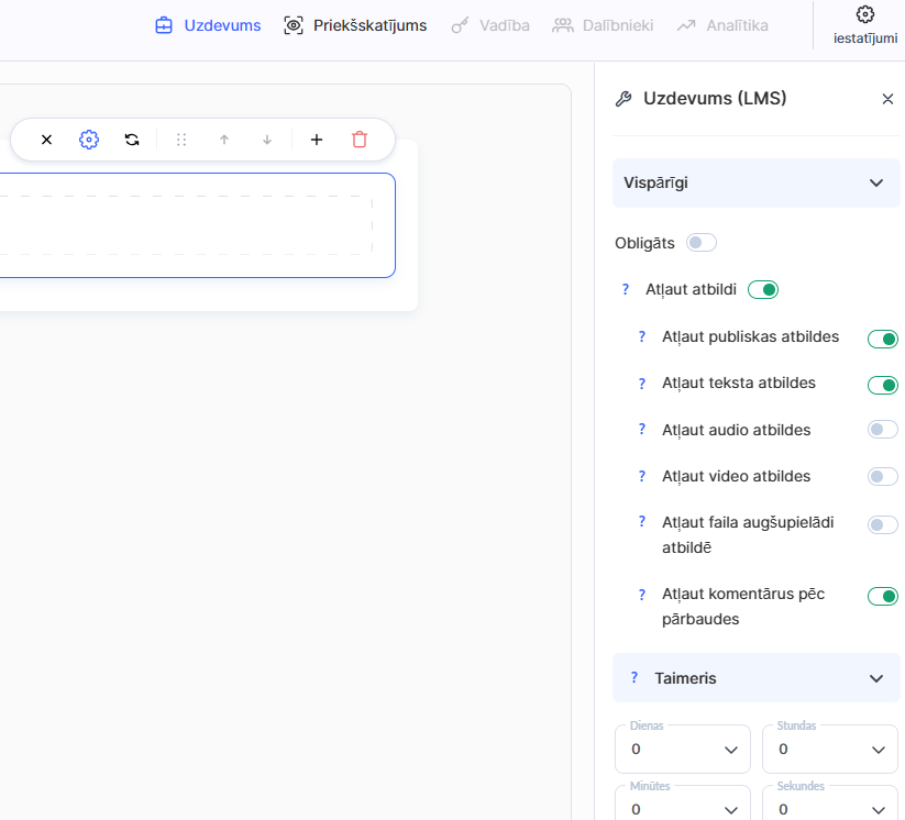 Atļaut atbildes — ja šī opcija ir aktivizēta, students/-e var iesniegt atbildi jebkurā formātā. Ja tā ir deaktivizēta, uzdevums kļūst tīri teorētisks vai informatīvs, un studentam/-ei nav pieejams atbildes lauks.