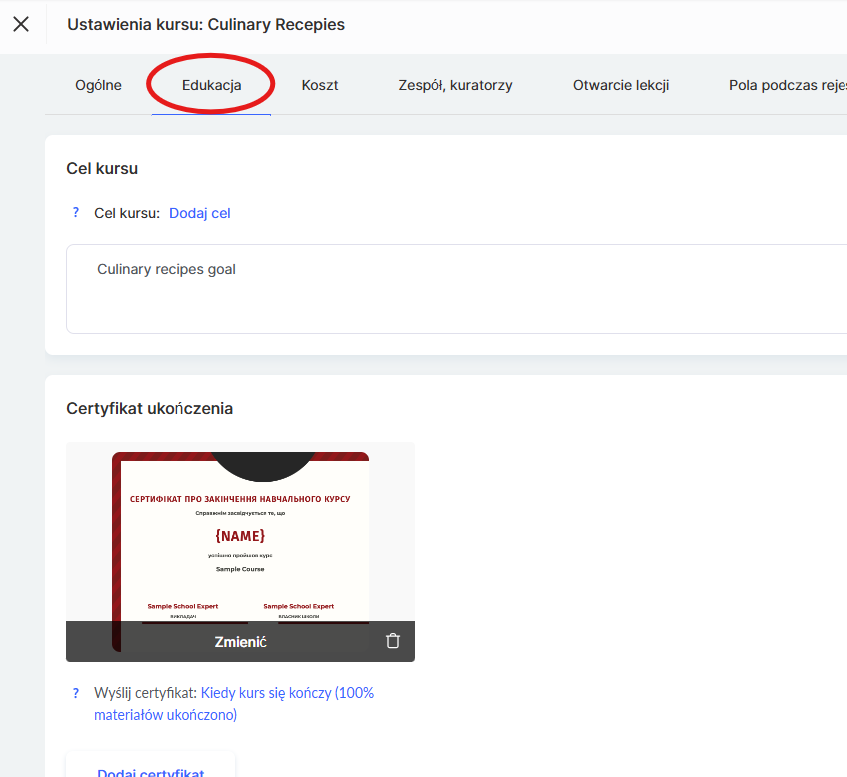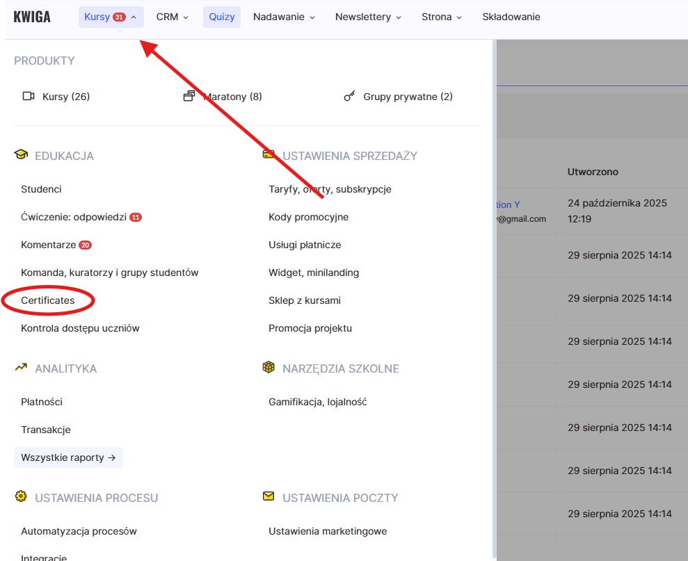 1. Przejdź do sekcji Kursy → Certyfikaty.