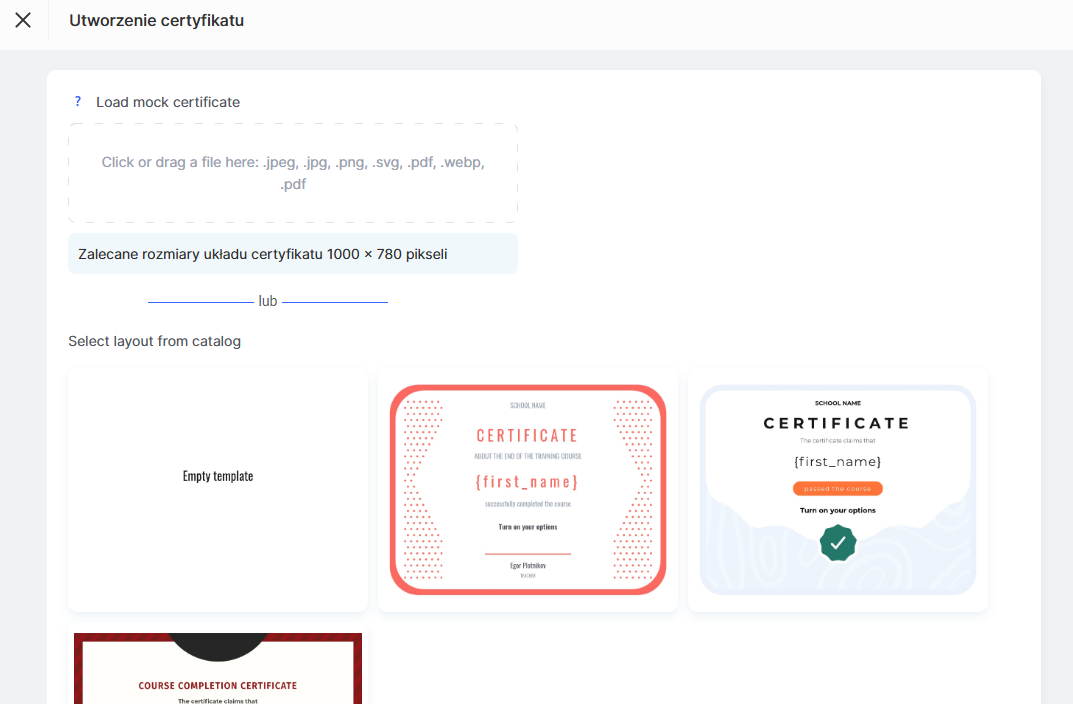 5. Prześlij własny projekt certyfikatu w formacie .jpeg, .jpg, .png lub .svg, albo wybierz szablon z katalogu gotowych wzorów.