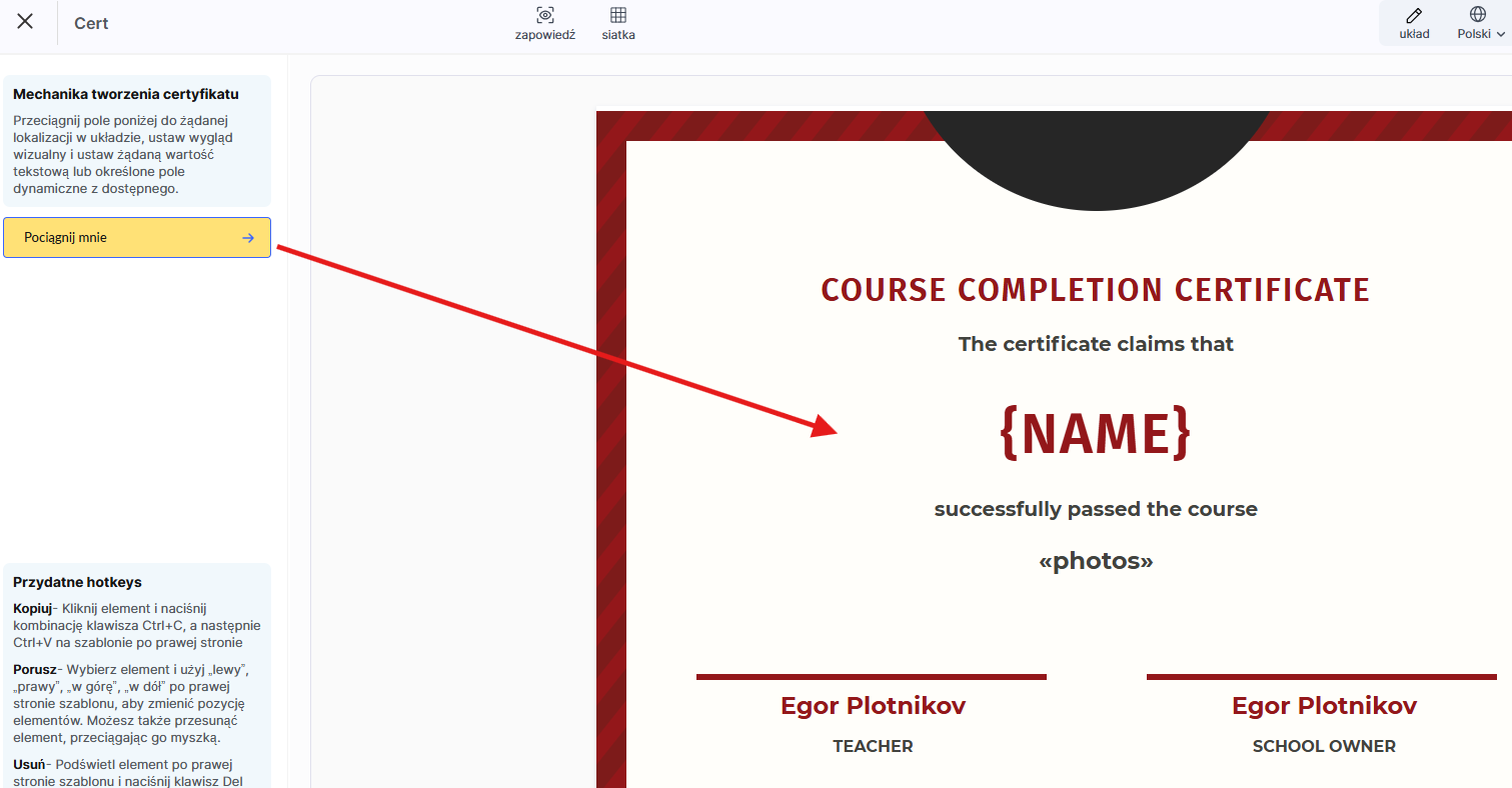 Za pomocą żółtego przycisku z napisem „Przeciągnij mnie na szablon po prawej stronie” możesz dodać nowy blok tekstowy na certyfikat.